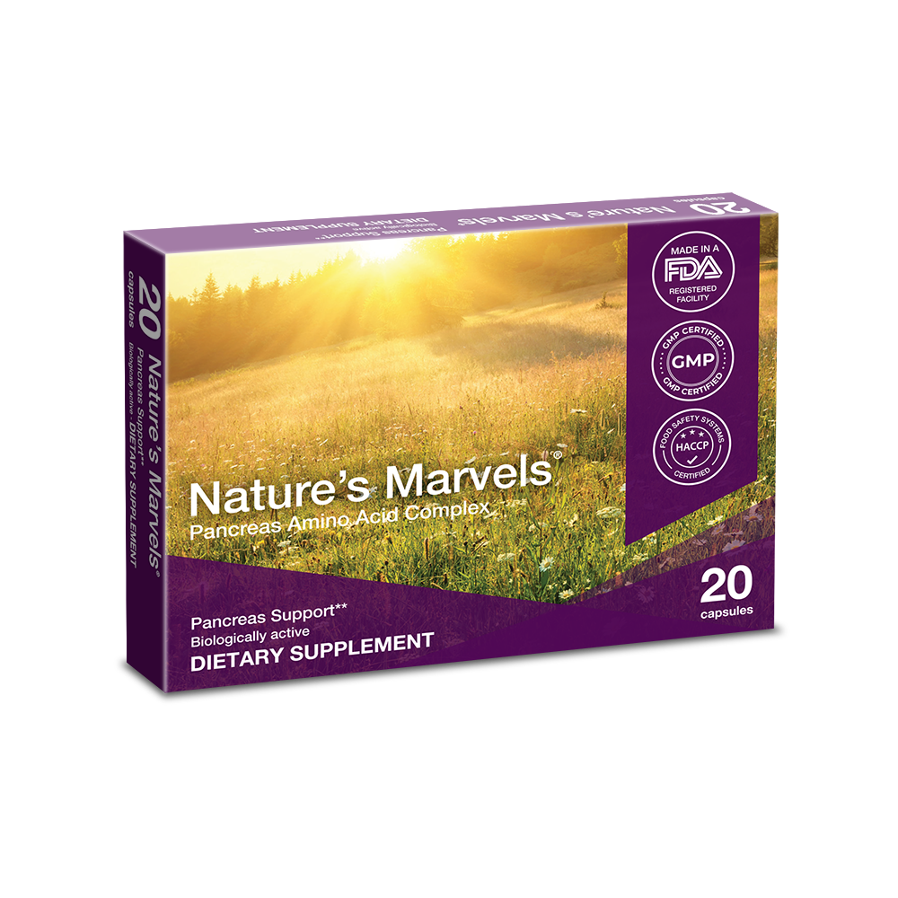Nature’s Marvels™ Pancreas Bioregulator is an amino acid complex that regulates the activity of the pancreatic enzymes, and in doing so has been shown to decrease sugar levels in diabetics and restore normal pancreatic tissue in those with Chronic Pancreatitis.